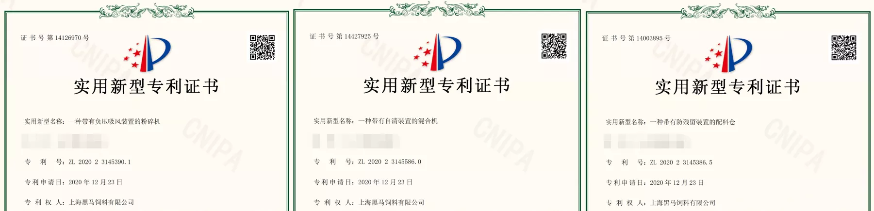 其中的核心設備混合機、粉碎機配料稱被國家知識產權局授予專利。