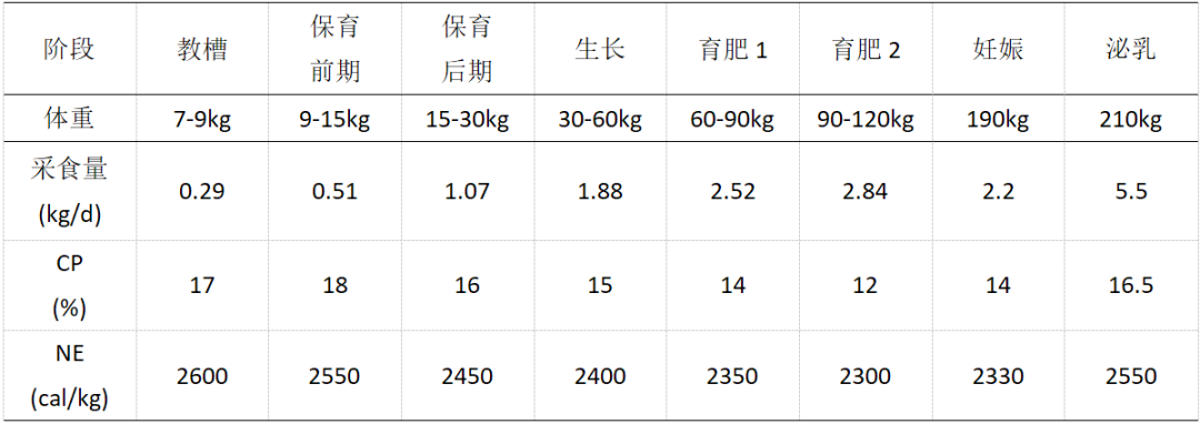 三、不同階段豬采食量、粗蛋白和凈能設置推薦